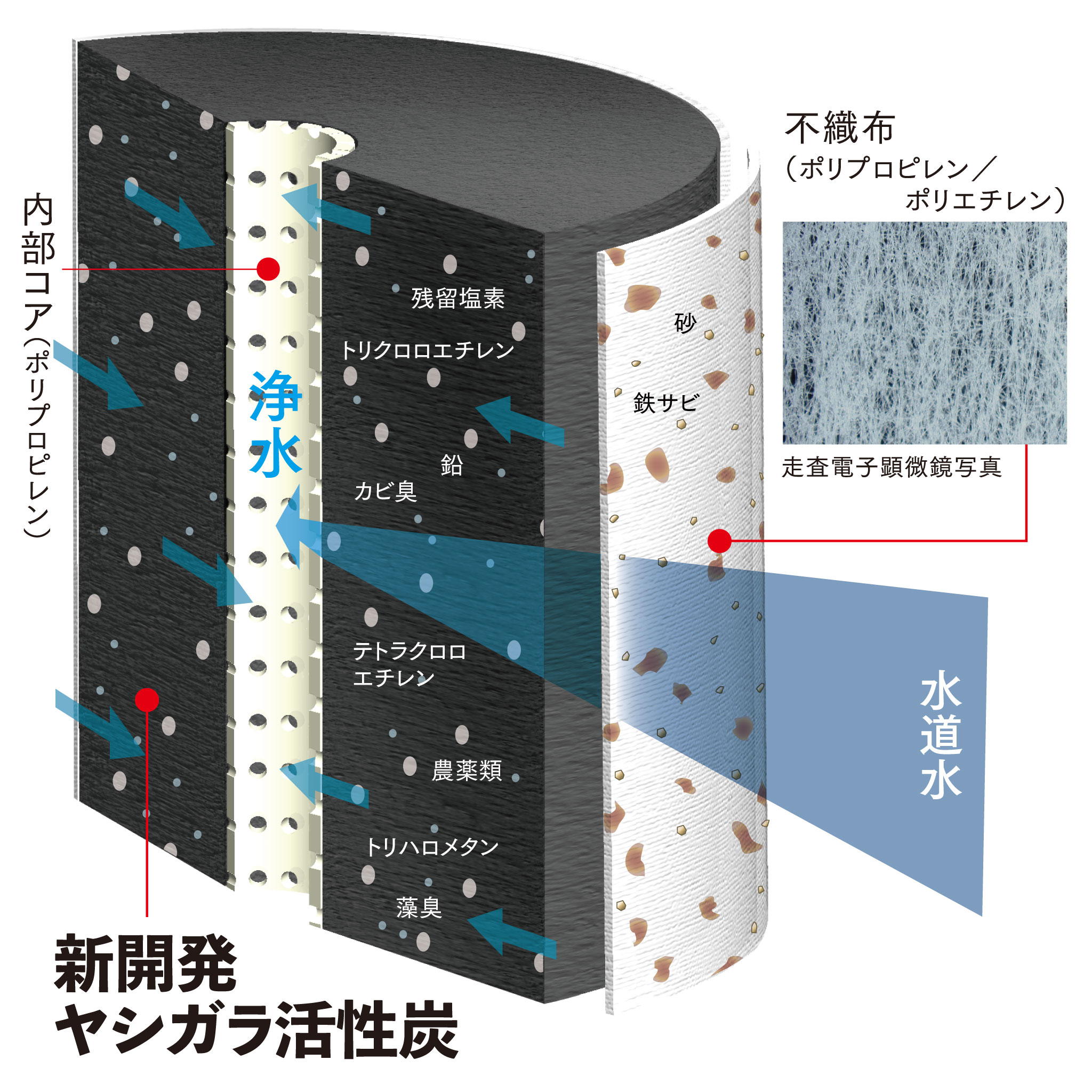 水道水には様々な大きさや種類の微粒子が含まれています。ヒカリックスに搭載している新開発したヤシ殻カーボンフィルターの活性炭は、製造時に微細孔径・細孔容積を調整することで、様々な大きさの微粒子を吸着することができます。高い浄水性能と目詰まりしにくいという特徴を持っています。毎分20リットル以上の通水性能を継続的に発揮することができます。