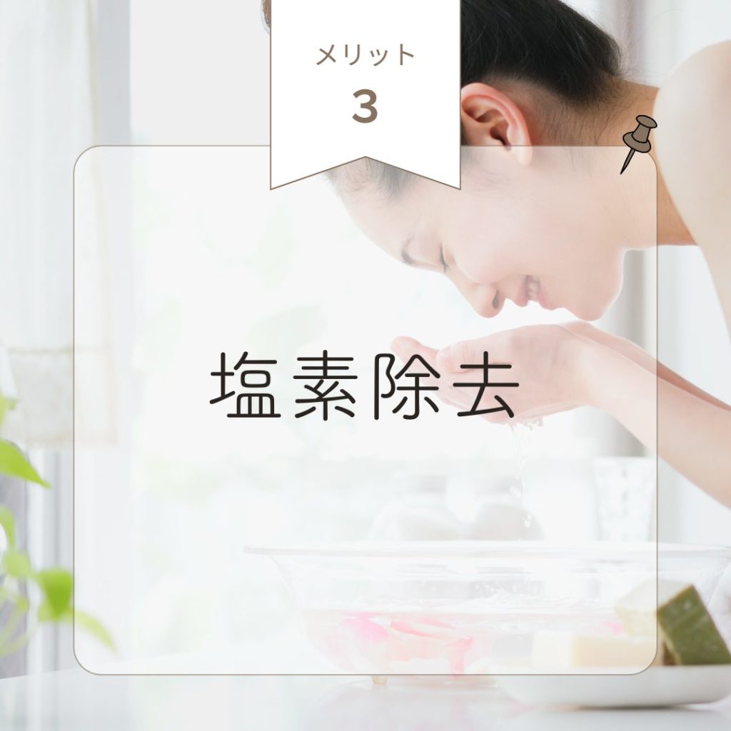 塩素は肌のたんぱく質を破壊し、細胞にダメージを与えてしまいます。肌の保水力や保湿力を低下させ、乾燥・小じわの原因となります。