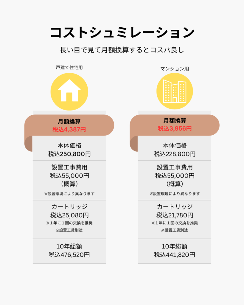 製品本体は10年保証。フィルター交換は最長1年ごと。長期間使えて経済的。