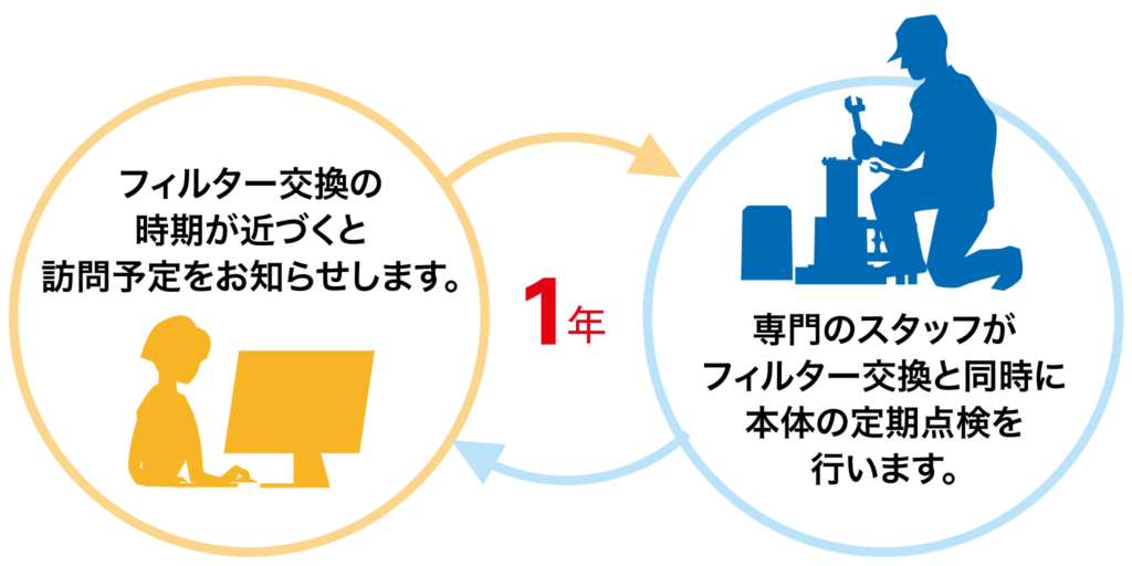 A.安全な浄水をご使用いただく為に、年に1回のフィルター交換を推奨しています。 弊社のメンテナンススタッフがメンテナンス時期をお知らせし、日程調整の上訪問させていただきます。