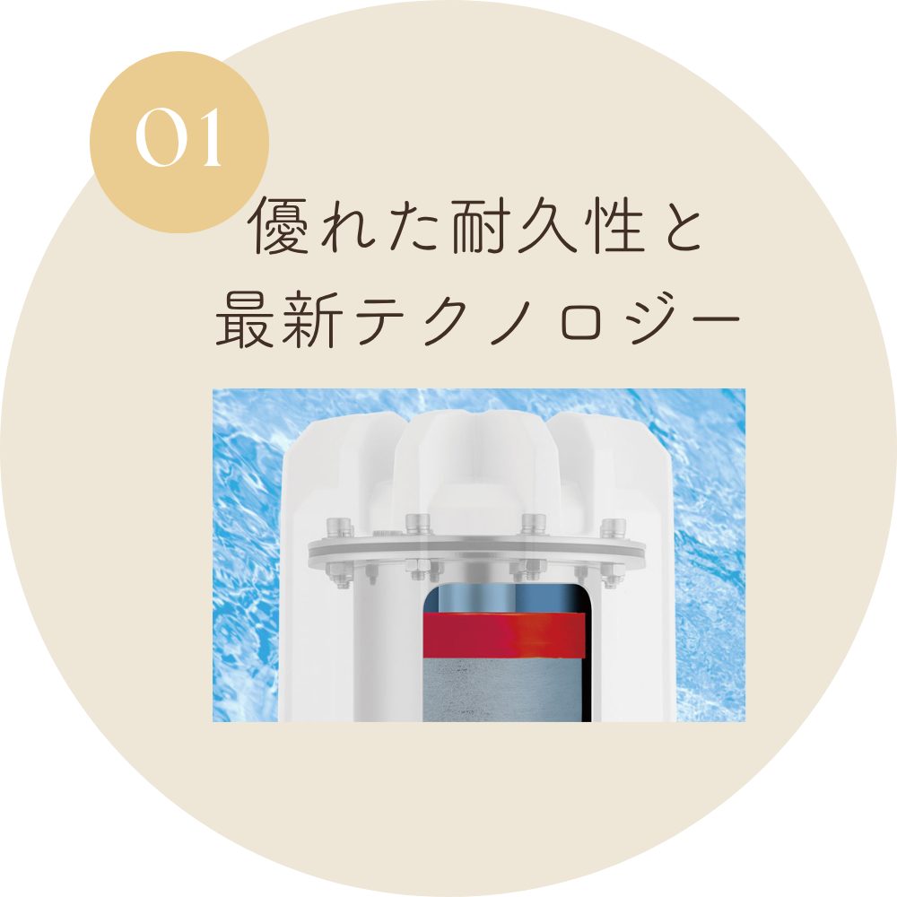 高性能の新開発・ヤシ殻カーボンフィルター採用。おいしい浄水を安定供給します。