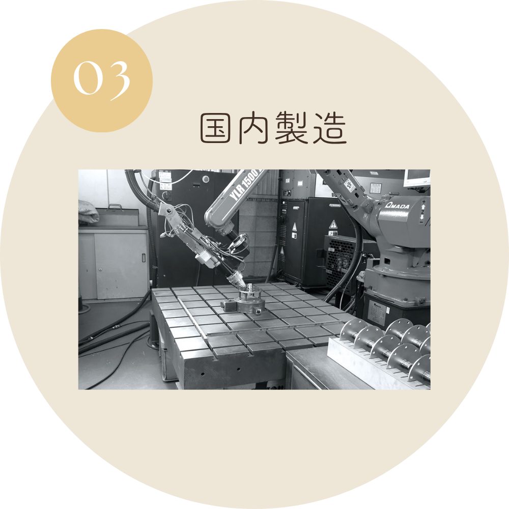 厳重な品質管理と検査体制を導入しながら、製造から組立まで、すべての工程を日本国内で行っています。海外製品によくある急な製造中止や供給滞りなどのリスクを最小限に抑えることができます。